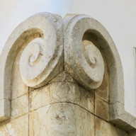 Decorated natural stone holders for flag sticks. Abstracted decorations in protruding naturestone motifs over windows and doors. V-shaped openings/stacks with stucco or natural stone elements.